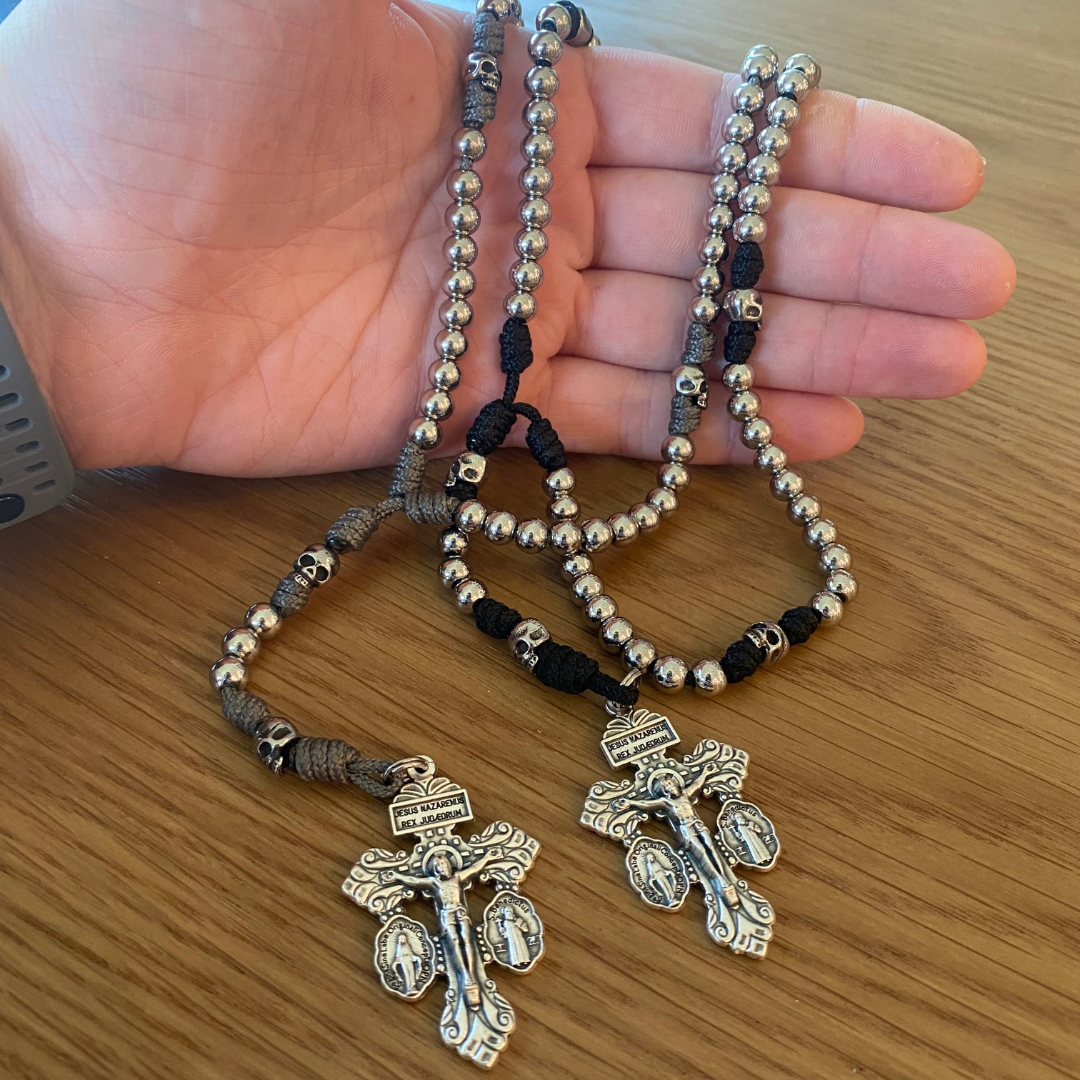 Our rosaries were born out of necessity. With two younger brothers who would break even the toughest rosaries. The we started making paracord rosaries, and they haven't broken any since.