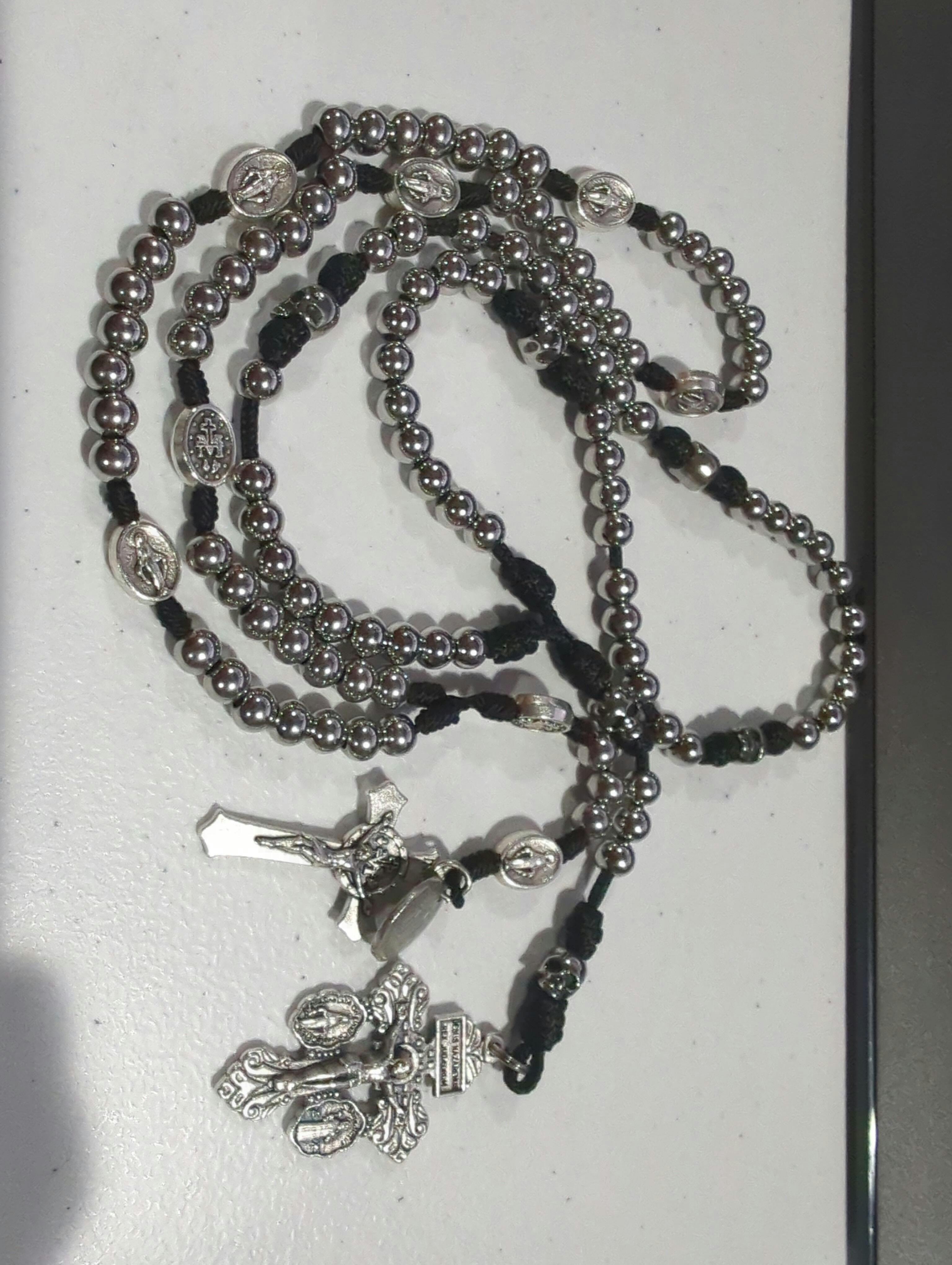 A beautiful and durable pocket rosary. This miniature rosary is perfect to take anywhere as you grow in your devotion of the Holy Rosary and remember that you are dust. Choose between grey and black 95lb paracord. These rosaries are handmade in the U.S.A with high quality materials meant to last a lifetime.
