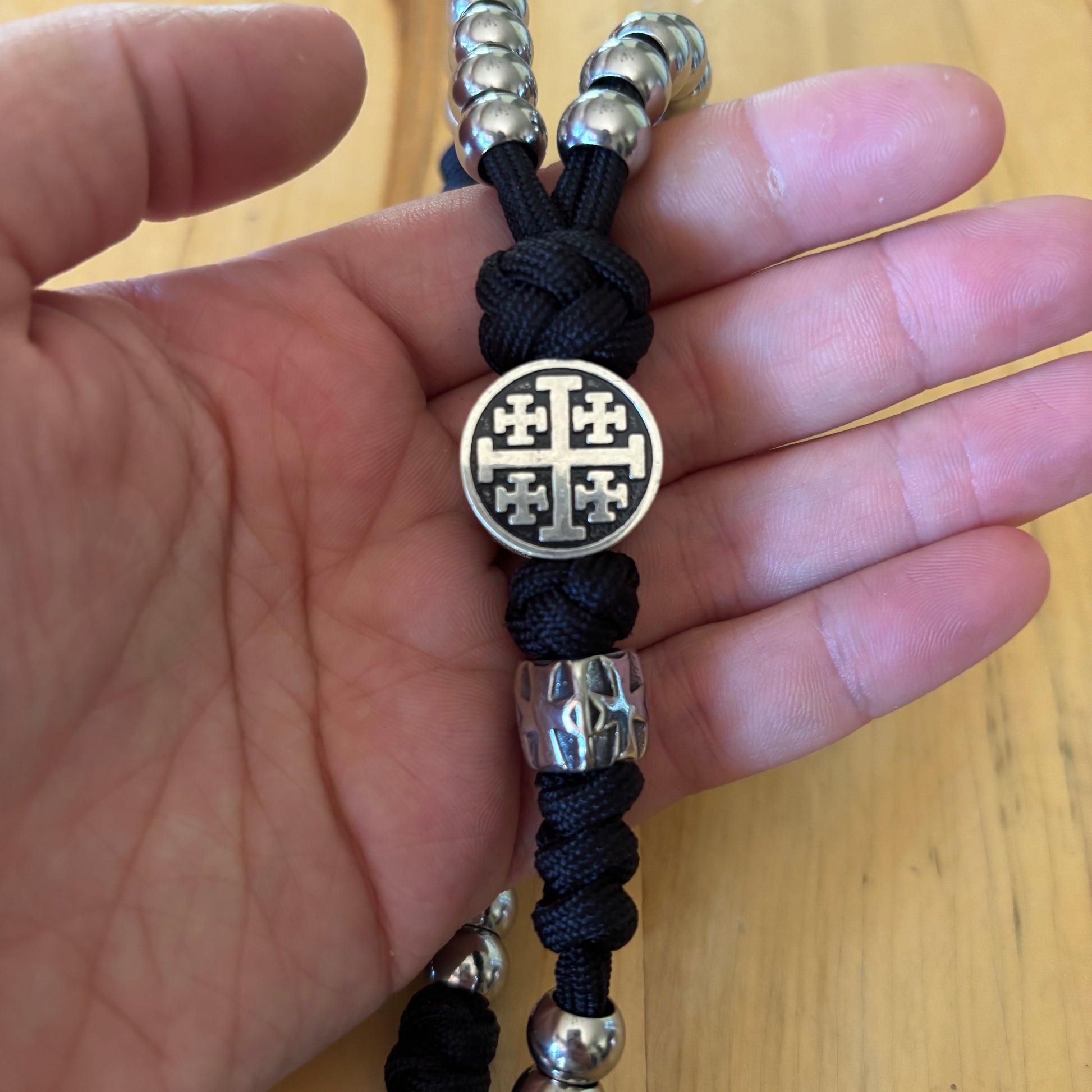 Made with solid stainless steel beads, a steel Jerusalem Cross centerpiece, as well as two strands of Military Spec Paracord, this rosary will not fall apart easily.